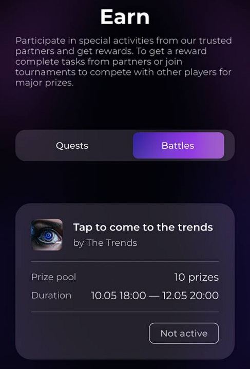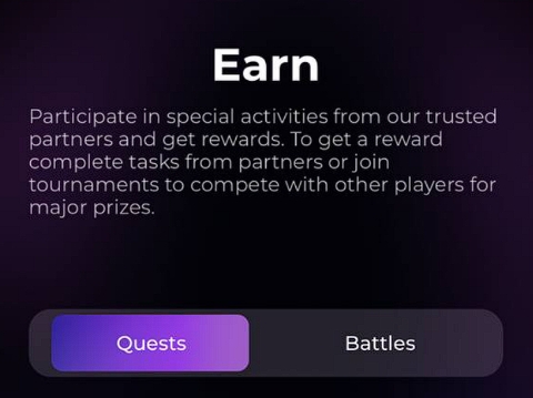 Quests - a section where you can complete social tasks such as subscriptions, retweets and receive game points for this