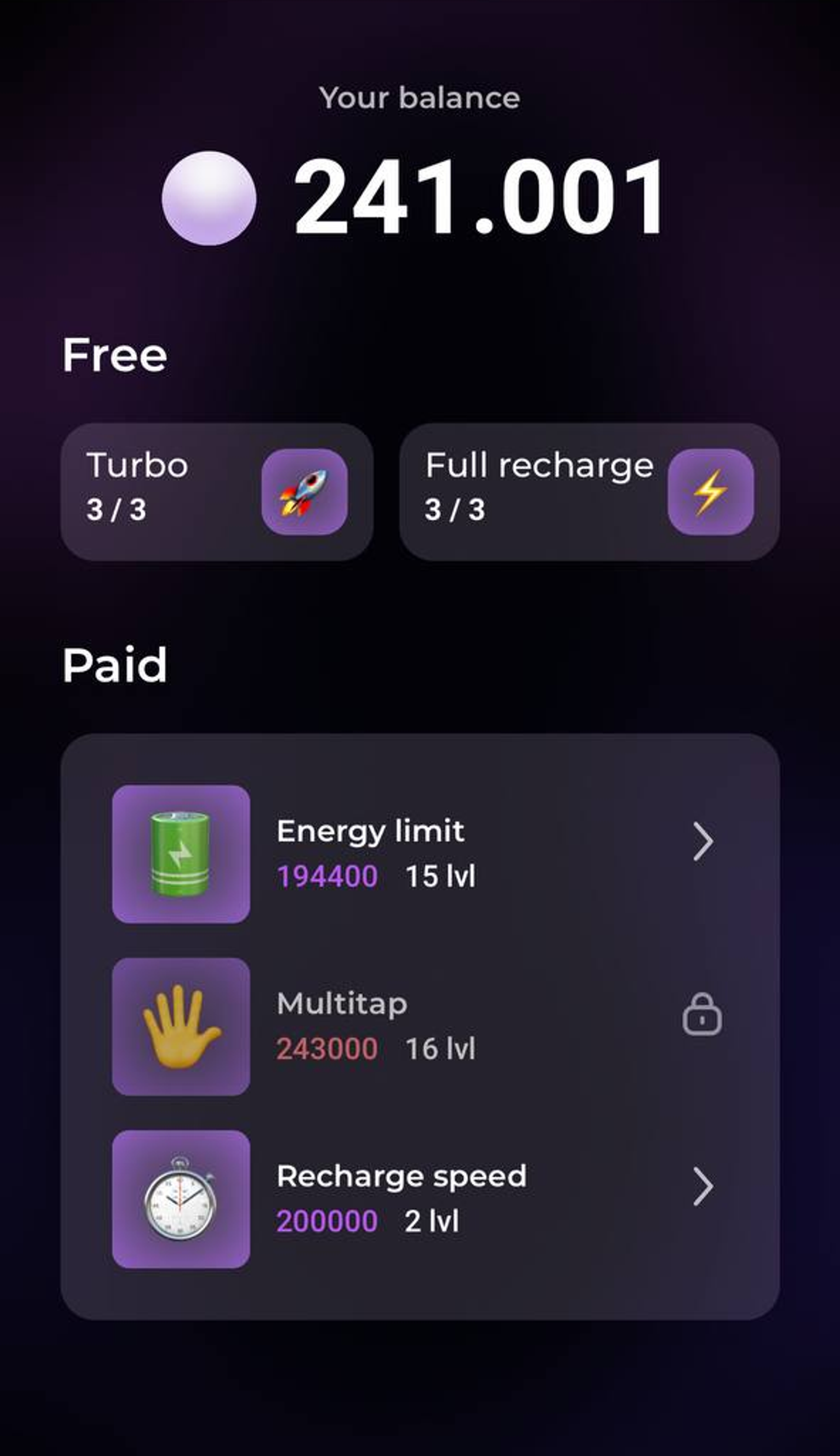 Paid - boosts that increase the characteristics of the clicker forever. Can be upgraded with points:
